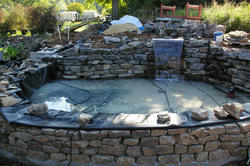 Start of raised pond with patio and bench Just finished the prep work for the project. Another picture after completing the prep work. A picture of current progress
