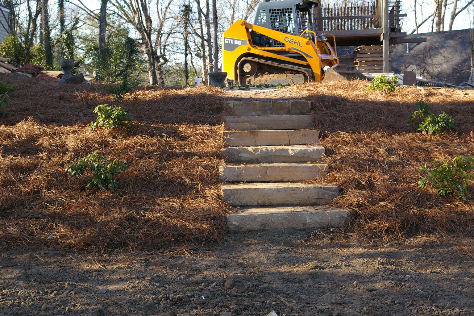 Engineered block walls, stone steps, fountain. Pictures of Block wall, patio, steps, and fountain we installed. Picture of finished wall. Flagstone patio with mondo filled joints and disappearing fountain. Stone steps.
