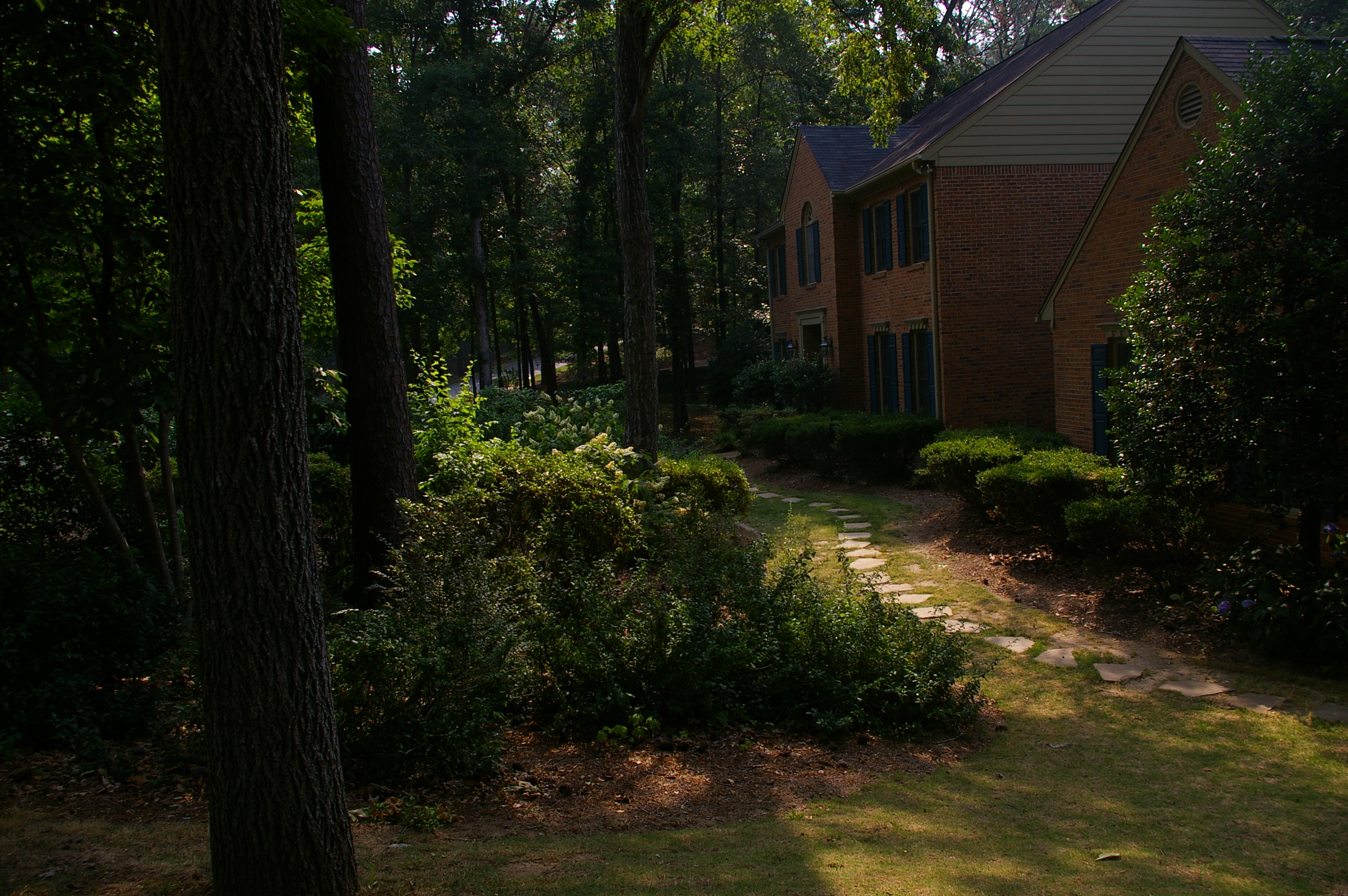 We removed 11 trees from this yard, ground the stumps, regraded and installed sod.